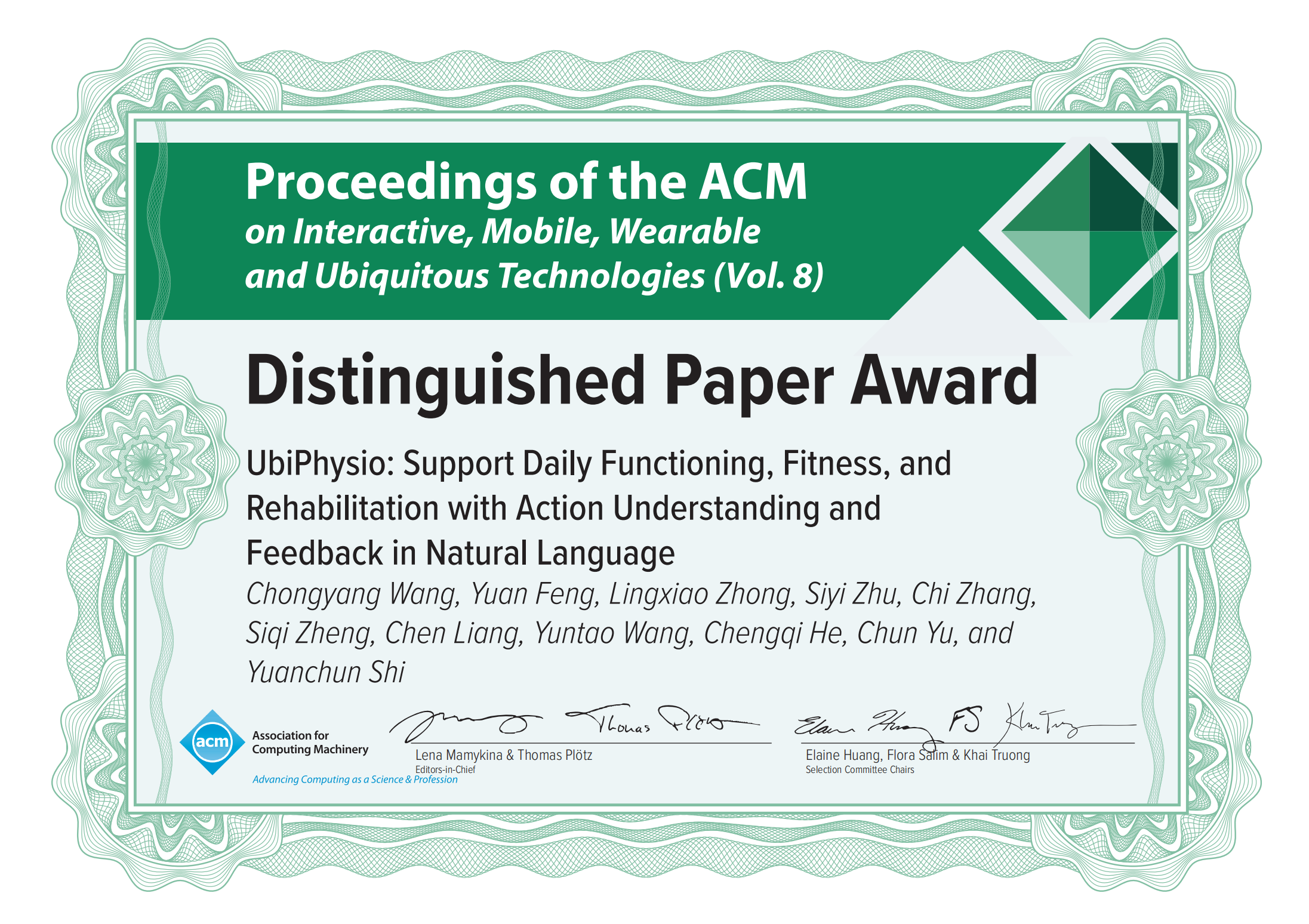 On October 15, a collaborative study conducted by Tsinghua University's Pervasive Human-Computer Interaction Laboratory, Sichuan University's West China Hospital Rehabilitation Medicine Center, and Sichuan University's Institute of Rehabilitation Medicine, titled "UbiPhysio: Support Daily Functioning, Fitness, and Rehabilitation with Action Understanding and Feedback in Natural Language," received the Proceedings of the ACM on Interactive, Mobile, Wearable and Ubiquitous Technologies (IMWUT) Distinguished Paper Award at the ACM International Joint Conference on Pervasive and Ubiquitous Computing (UbiComp 2025).