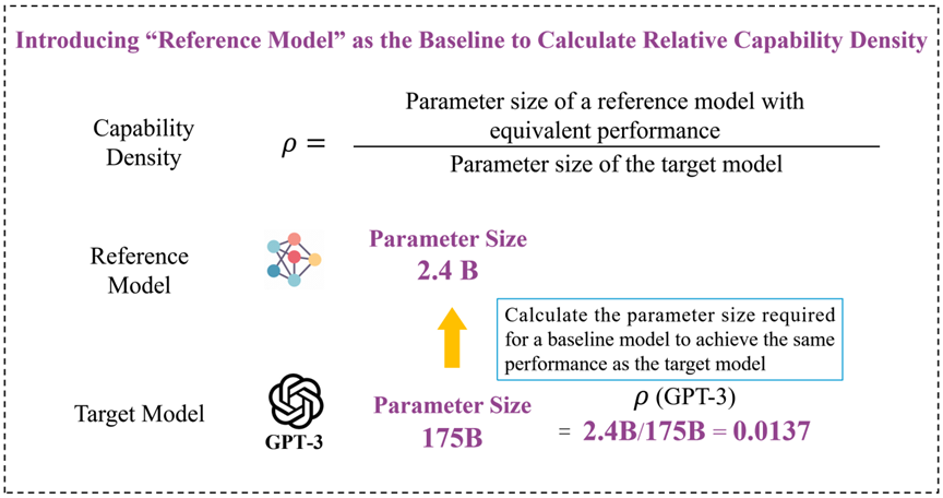 The research team designed an evaluation framework for relative "capability density". First, the team selected a series of reference models and established the scaling curve between the parameter size and performance. Based on this, the team set the capability density of the reference models to 1, serving as a baseline for measuring the capability density of other models. The capability density of a given target model is then defined as "the ratio of the parameter size of a reference model with equivalent performance to the parameter size of the target model".