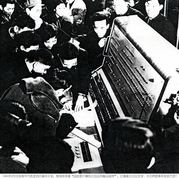 日本青年代表团访问清华大学,观看911计算机打印输出纸带上的文字:“中日两国青年友好万岁”