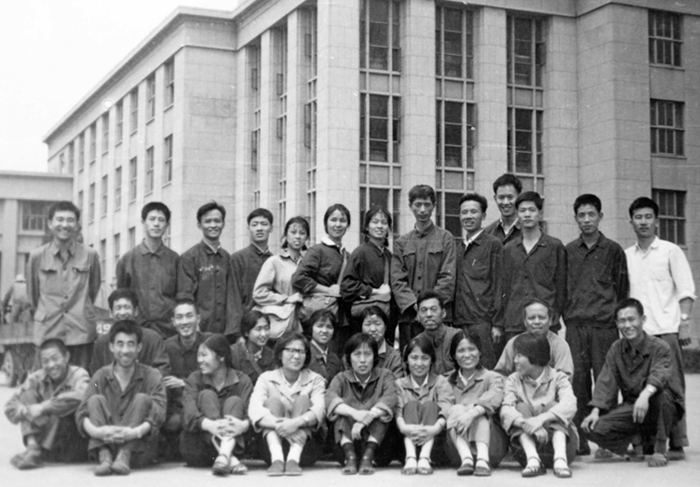 带队老师和程4(1974级)学生赴工厂开门办学前在主楼合影