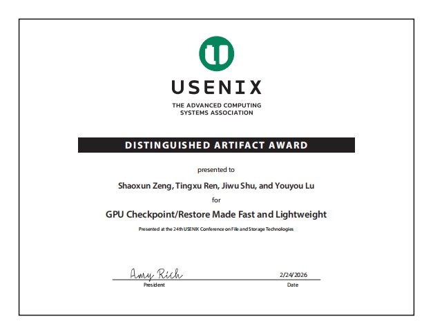 2月24日至26日,第24届USENIX文件与存储技术会议(USENIX Conference on File and Storage Technologies, FAST)在美国圣克拉拉举行。清华大学计算机系存储实验室研究论文“GPU检查点保存和恢复的快速和轻量级方案”(GPU Checkpoint/Restore Made Fast and Lightweight)获得杰出技术贡献奖。该论文第一作者为计算机系2021级博士生曾少勋,导师为计算机系副教授陆游游。