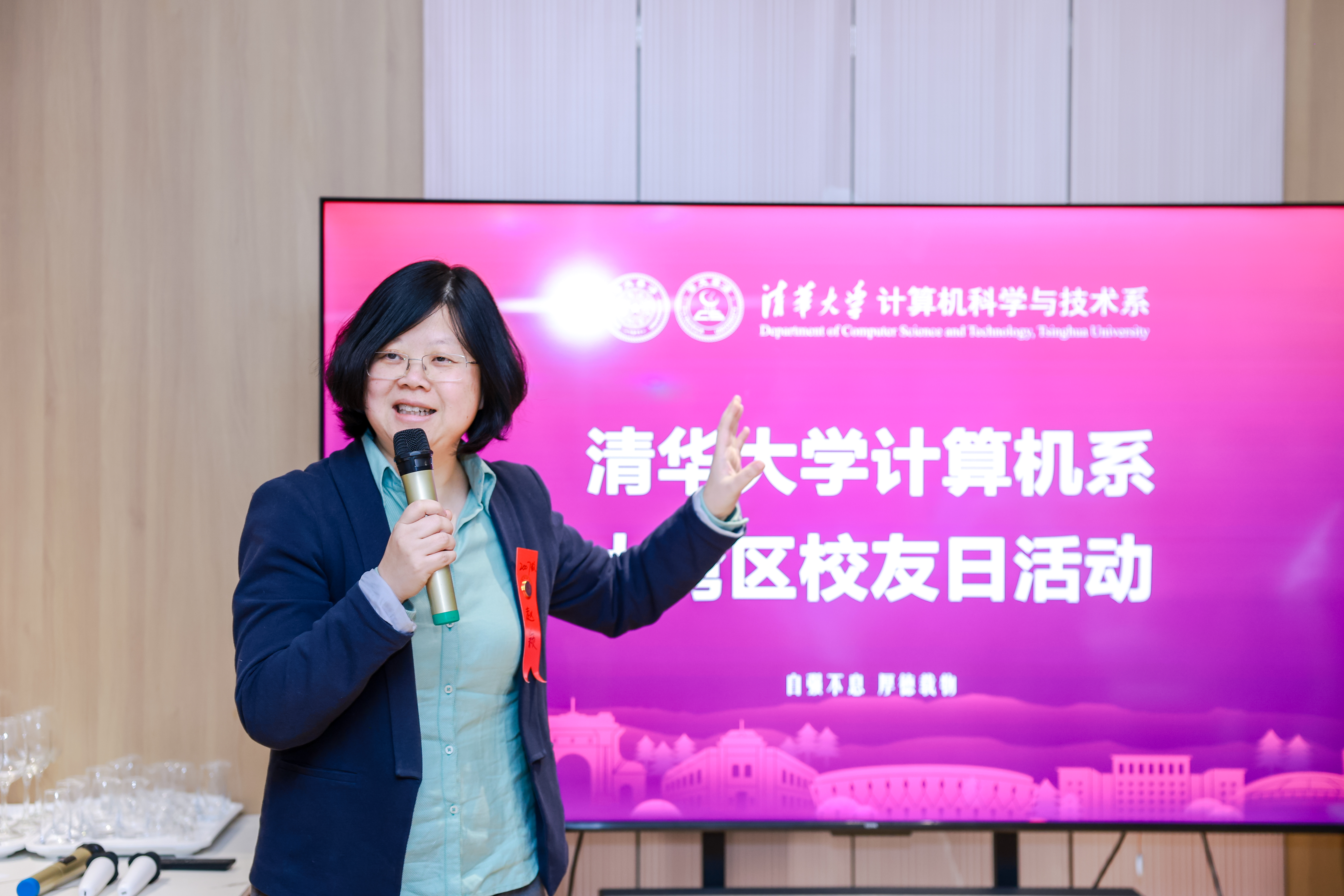 尹霞在致辞中介绍了计算机系的整体发展情况。她表示,从清华园到深圳湾,虽距离遥远,但水木情怀却跨越时空,紧密联系着大家,很高兴能与校友们相聚在深圳,这是一座改革开放的前沿城市,其“创新”气质与计算机人的“创新”精神一脉相承。未来期待能与大湾区校友们戮力同心,共同为国家粤港澳的战略发展贡献更多清华人的力量。