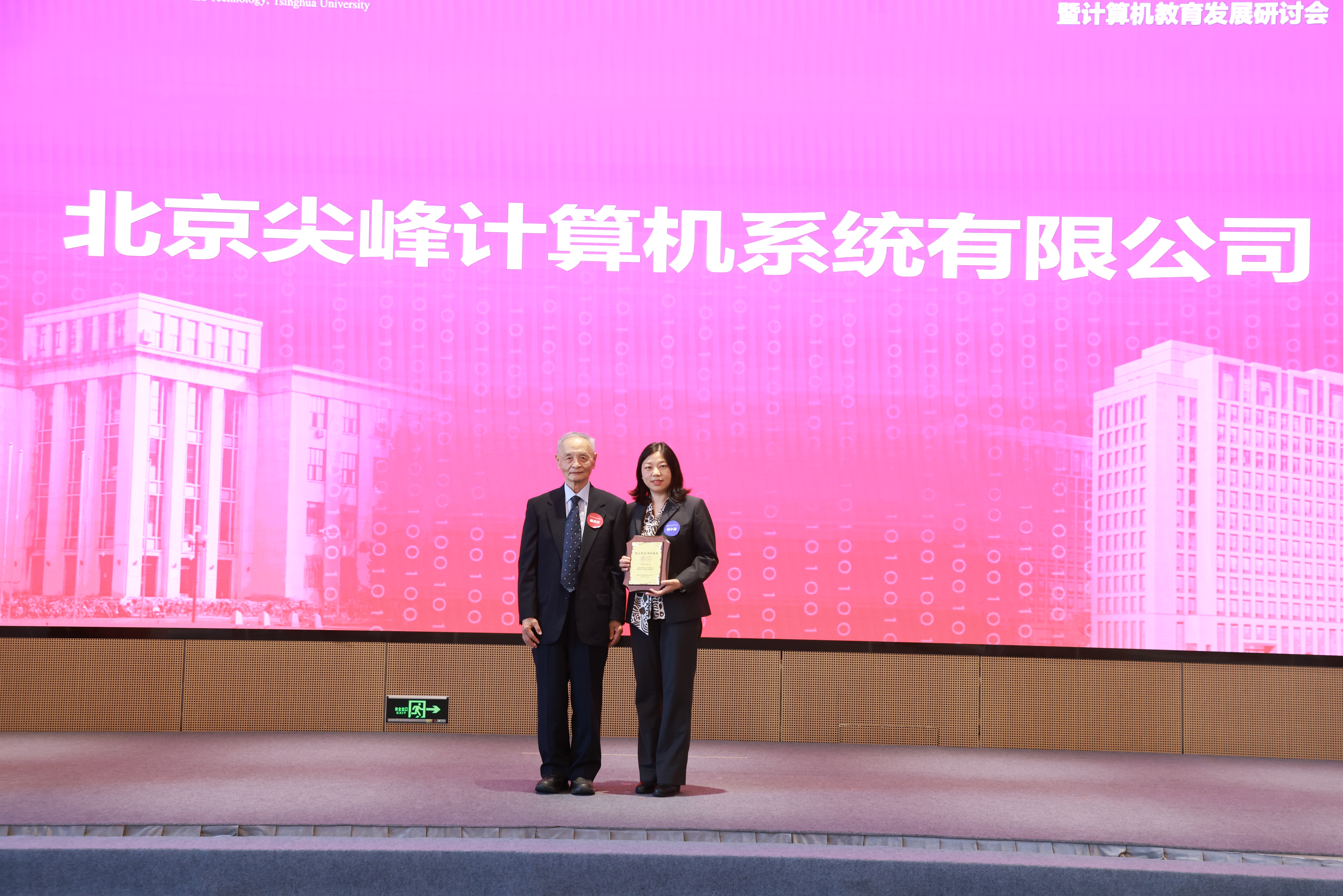 杨天行为北京尖峰计算机系统有限公司代表、总经理任小芬颁发捐赠纪念牌