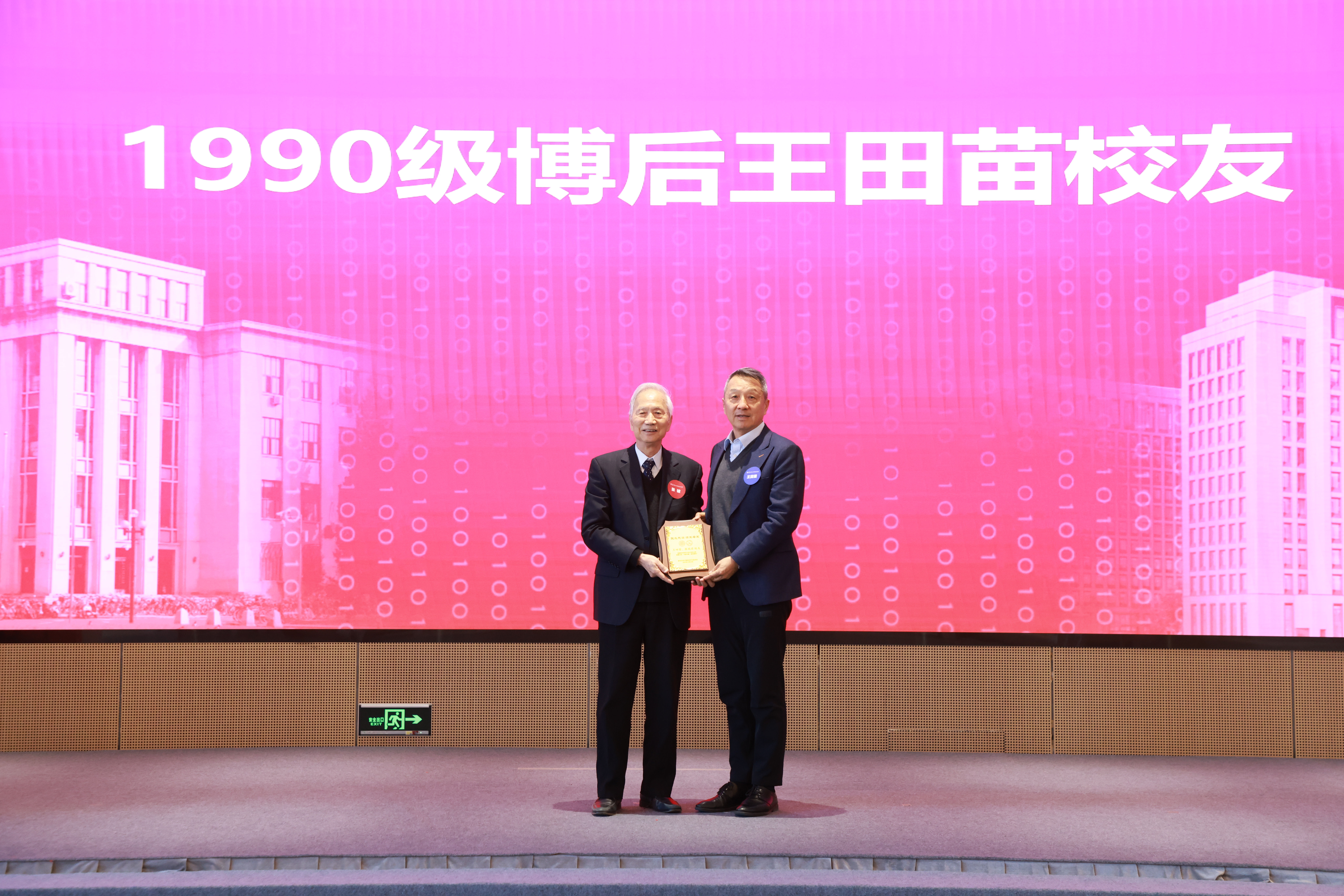 张钹院士为1990级博后校友王田苗颁发捐赠纪念牌