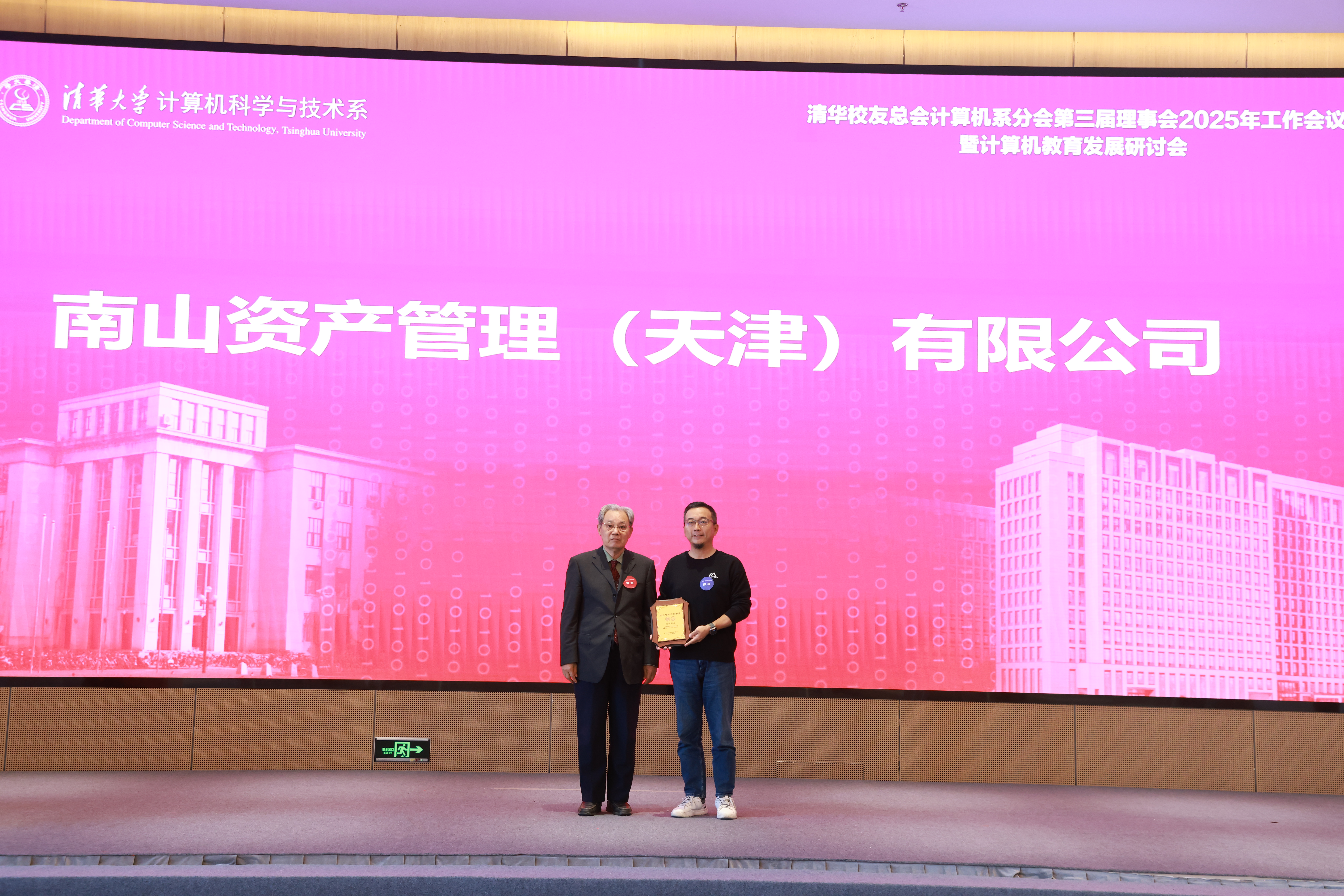 郑纬民院士为2010级校友、北京长亭未来科技有限公司联合创始人、副总裁龚杰颁发捐赠纪念牌