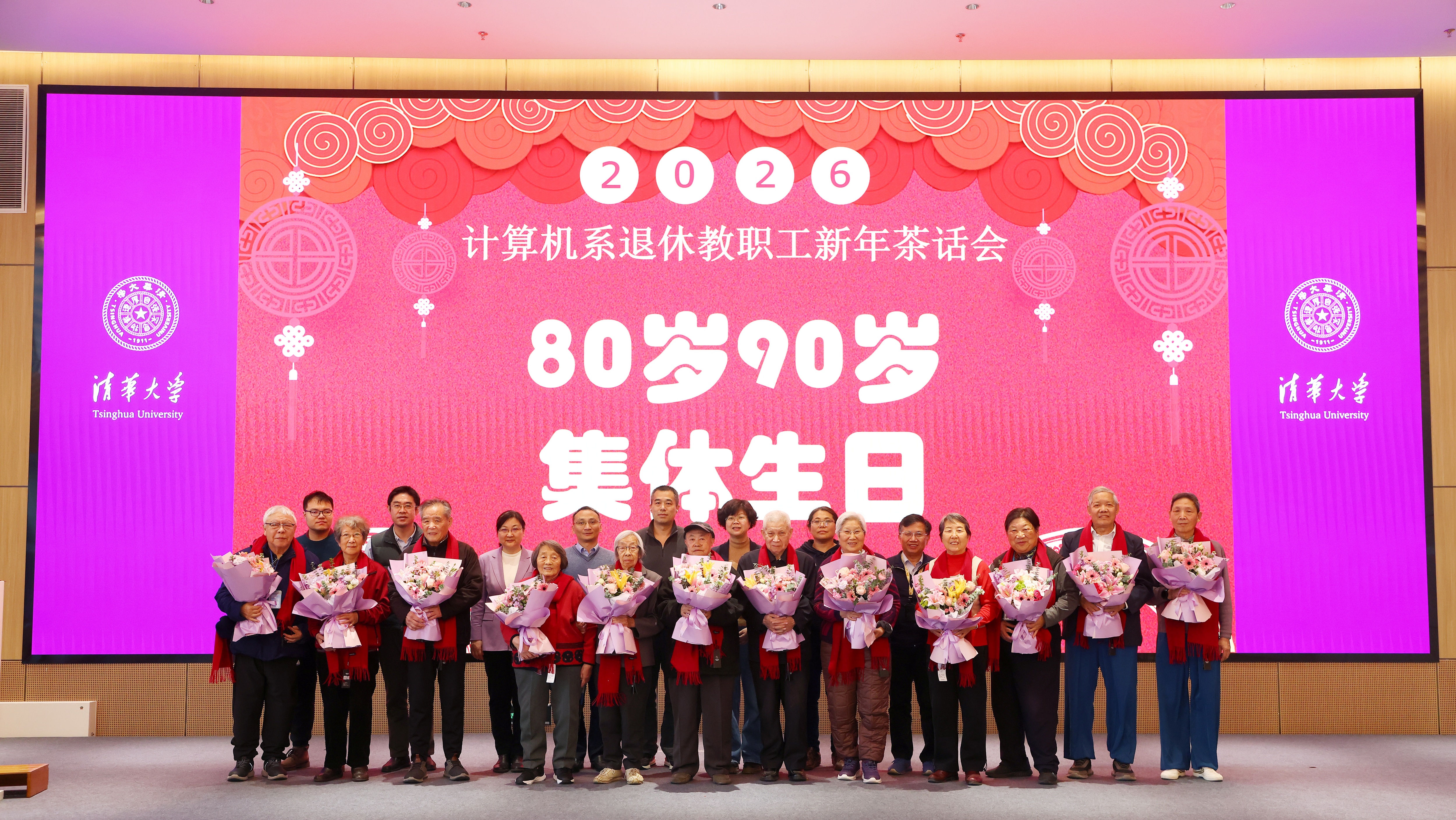 本次茶话会还为2025年年满90周岁和80周岁的退休教职工集体贺寿,尹霞与系二级单位代表共同为寿星们献上鲜花,齐唱生日歌并合影留念。