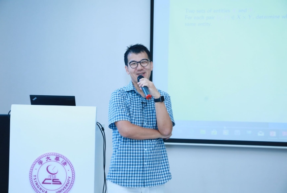 陶宇飞教授做了题为“主动分类器下的实体匹配”的学术报告,介绍了实体匹配问题的问题定义、带删除的随机探测算法(Random Probe with Elimination)以及该算法达到理论下界。陶宇飞教授语言生动,深入浅出地与听众分享从问题形式化的确立到建立算法理论下界的整个过程,令听众领略算法理论研究之美。