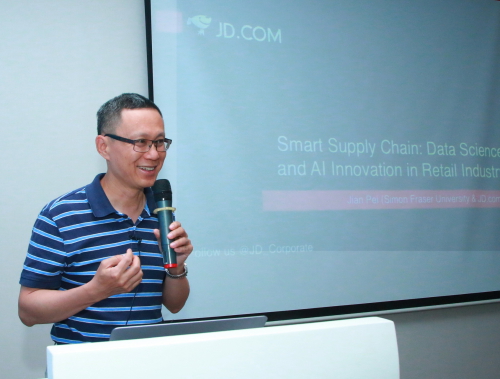 本次报告的题目是“智慧供应链-在零售业中的数据科学和人工智能创新”( “Smart Supply Chain: Data Science and AI Innovation in Retail Industry”)。报告分析了传统零售业中的数据科学问题,以及从线下到线上给数据科学带来的挑战。报告介绍了京东在零售业中的人工智能和数据科学创新,包括智能自动售货机、智慧零售商店解决方案、京东智慧便利店、增强现实化妆和个性化推荐等。报告进一步揭示了这些创新背后的人工智能技术和工程,目的是通过信息的流动来减少货物和资金的流动从而降低成本,并以闪购、街边店、拼购、市场营销网络传播、创新的供应链中店+前置配送中心等为例进行阐述。最后提出了智慧供应链所包含的三方面内容,即智慧供给、智慧物流和智慧消费,以及大数据使能的无界零售即服务的概念及框架。